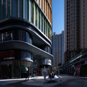 方圆荟商业综合体作为香港财富中心三块地的最后一期,南侧邻城市快速道,被14m宽的市政公园绿带隔离;地面大量消防登高面,铺装太大,金街与外环商圈缺少联动,缺乏吸引力。以“丹成鲤跃,云开仙飞”为灵感,引九鲤湖之水,演变“九鲤浮光,鱼跃龙门”文化概念,外街地面借助市政公园一体化空间,街面整体打开,扩大商街延展面与展示面,打造体验式公园里的商街;空中通过三座桥最大化导入周边资源,连接南侧和东侧住宅,桥和建筑的链接雕塑化,强化原创IP场景化体验式游乐,重构街区活力,把沿街和内街(金街)艺术化的3个主题形成户外第五课堂,结合云仙IP与涂鸦形成独特的昭示性,“以玩带商”,引领先锋商业体验,最大化的吸引城市人流,提升商业价值。